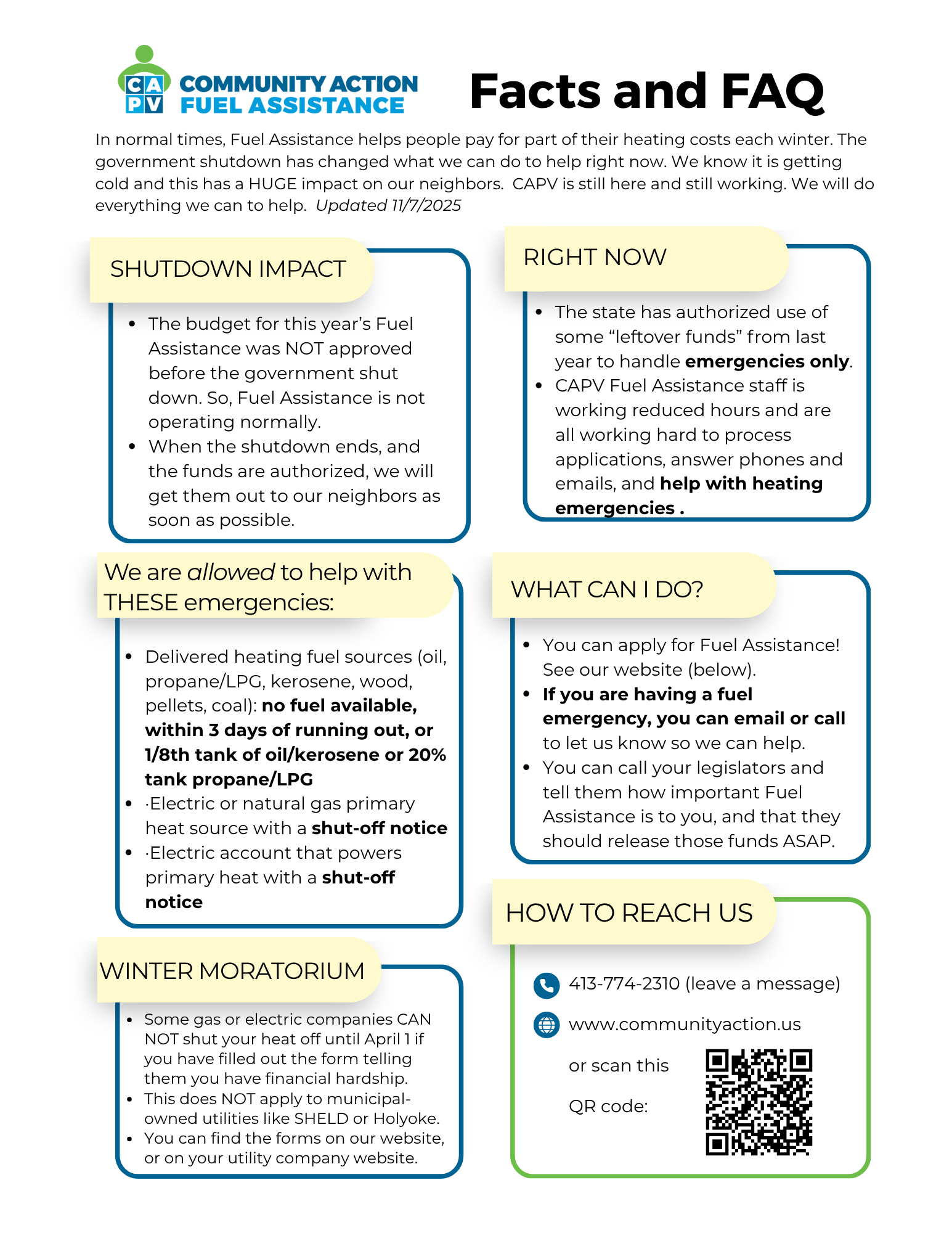 Learn about the latest updates in the FAQ flyer from Community Action Pioneer Valley below. Contact your local HEAP program for more information.